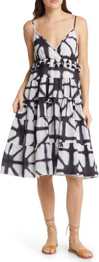 Festive tassels alternate between black and white on this modern A-line dress showcasing a gorgeous batik print.