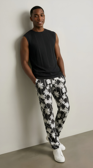 Make a statement in this men's sleeveless shirt: a bold black base contrasted by a crisp white palm print for a modern, tropical edge. Pair with swim trunks or printed shorts for a coordinated beach look, or with chinos and sneakers for warm-weather street style.