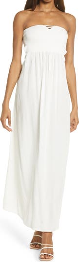 A strapless silhouette and a strappy open back let you show plenty of skin in this hand-stitched maxi dress with a comfortable smocked bodice.