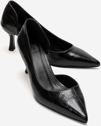 A sculpted stiletto that reinterprets classic lines with a glossy croc-print finish