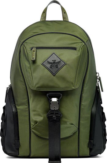 MCM Aren Backpack in ECONYLÂ<sup>®</sup> and Monogram Print Leather, Main, color, Khaki Moss
