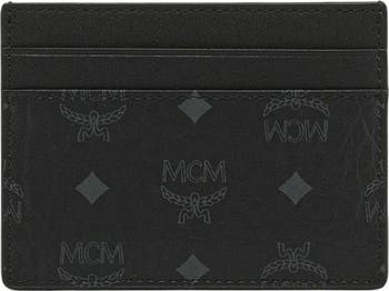- The compact Visetos card case is printed with the signature MCM letters, laurels, and diamonds