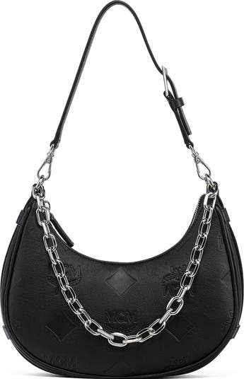 Natural full-grain leather hobo shoulder bag with embossed Maxi Visetos monogram, chain handle, and leather strap