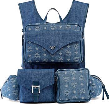Monogram denim jacquard modular backpack with detachable pouches and natural leather trim