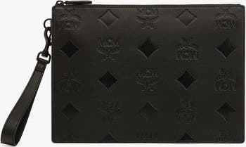 Natural leather standing zip pouch with embossed Maxi monogram and leather wrist handle strap