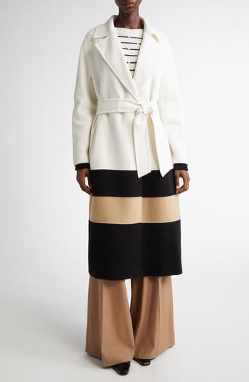 Double-face virgin wool creates enviable warmth and elegant drape for this three-quarter-length coat enlivened with colorblocked stripes.