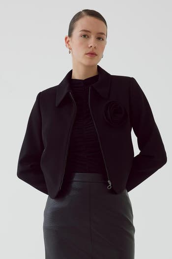The Rose Detailed Zippered Jacket offers a polished, versatile look. It adds a polished layer that works across day-to-evening looks. It layers easily over dresses, shirts, or knits and gives the look a clean finish.
