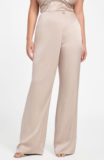 A unique overlap design at the front elevates the look of these wide-leg pants cut from lustrous satin.
