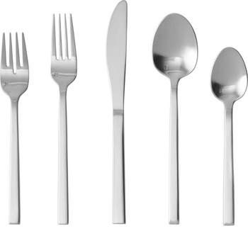 A brightly polished finish enhances the elegant look and feel of a stainless steel flatware set that edge out to sleek, square handles for modern style and a balanced feel.