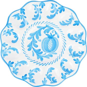 With bold patterns and splashy colors that harken back to the centuries-old tradition of Majolica, this egg platter makes a fresh statement that will call everyone to your welcoming table.