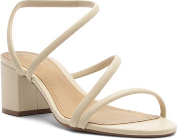Tubular, asymmetric straps amplify the striking dimension on a Brazilian-made sandal shaped from metallic faux leather and lifted by a wrapped block heel.