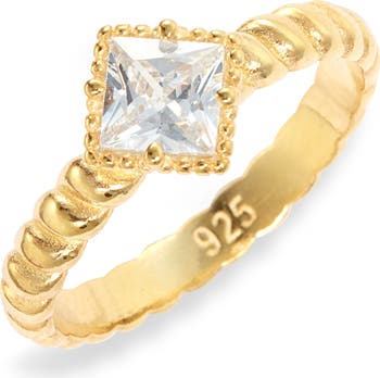 A sparkling stone serves as glamorous focal point for this twisted sterling silver ring plated in 14-karat gold.