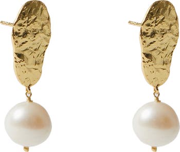 Sterling silver earrings plated in 18-karat gold enhance their dramatic flair with molten-textured pendants anchored by luminous freshwater pearls.