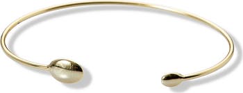 Elegant stacked or worn solo, a flexible cuff bracelet plated in lustrous 14-karat gold culminates in polished oval teardrops.