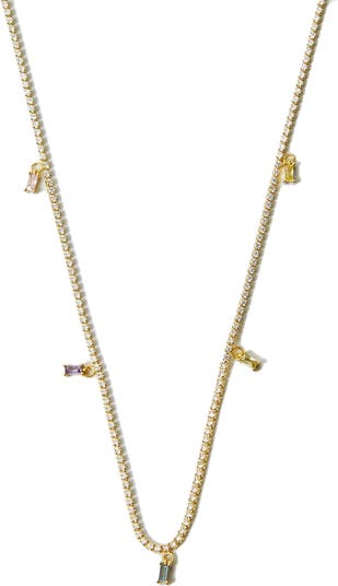 This sterling silver tennis necklace is stationed with baguette-cut charms and plated in 18-karat gold.