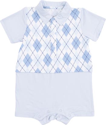 An argyle pattern brings preppy style to this polo-inspired shortall made from soft, stretchy fabric that is baby approved.