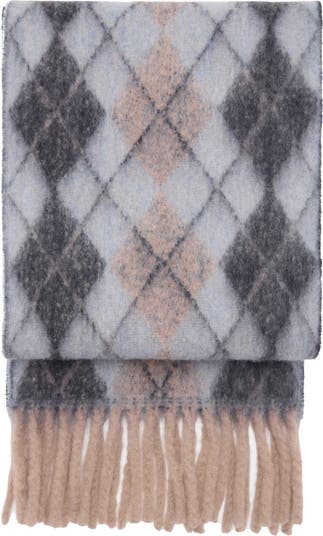 Add a traditional touch with a wool-kissed scarf finished in fringe and offered in a classic collegiate pattern.