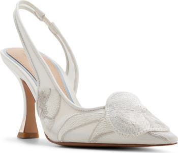 An embroidered flower is draped over the pointy toe and around the side of an elegant pump with a half d'Orsay silhouette that's perfect for your special occasion.