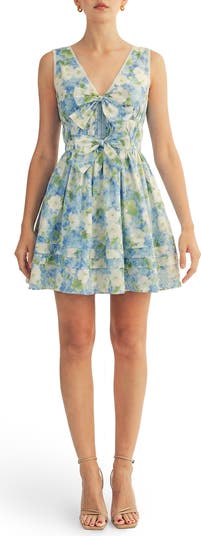 Darling bows sweeten this flowery fit-and-flare dress cut in a leggy length from crisp cotton.
