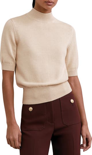 A sophisticated mock neckline and elbow-length sleeves frame this woolly cotton-blend sweater anchored by ribbed trim.