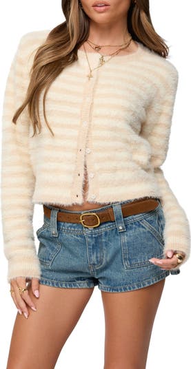 A fuzzy texture enhances the warmth and coziness of this striped crewneck cardigan that brings sweet style to sweater season.