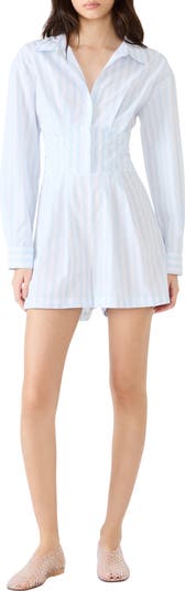 A corset-inspired waist adds shapely structure to this chic striped romper designed with shirt-inspired touches like long sleeves with button cuffs and a spread collar.