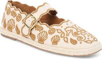Beach-inspired embroidery and scalloped trims bring distinct elements to an espadrille-inspired flat featuring an adjustable mary jane strap for a secure fit.