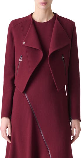 The Swiss house's notable tailoring and virgin-wool fabrication elevate this crop jacket styled in a mashup of moto themes and the brand's own trapezoidal motifs.