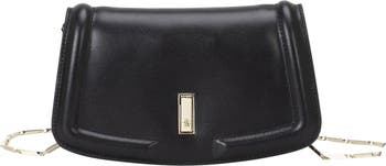 Gleaming logo hardware stands out against the rich leather exterior of a structured clutch fitted with a detachable chain strap for hands-free carry.