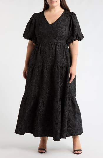 Tonal floral jacquard adds elegant texture to a tiered maxi styled with billowed sleeves and a triangular back cutout.