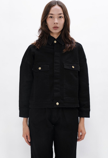 The Arizona Denim Jacket in Celeste features long sleeves, buttoned cuffs, and wide shoulders. It includes a front button placket and patched pockets with flaps. The jacket is made from upcycled denim, offering a sustainable choice.