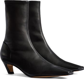An elongated snipped toe highlights the dramatic proportions of this sleek sock bootie elevated by Khaite's signature slanted heel.