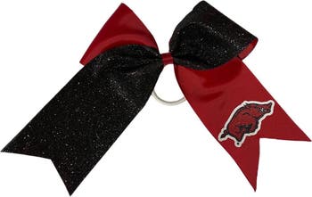 Make Arkansas Razorbacks spirit shimmer and shine with this Jumbo Glitter bow on a ponytail holder. It features a sparkly Arkansas Razorbacks logo and ribbon decorated in an allover glittery pattern.