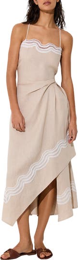 An embroidered trim and gathered waist slit add stunning dimension to this linen cover-up that elevates your poolside look with a soaring thigh-high slit.