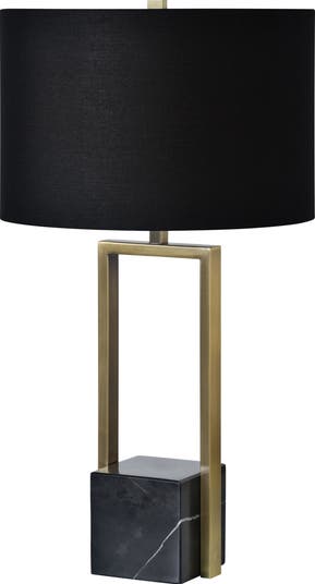 Add cosmopolitan style and a gleaming glow to your space with this table lamp featuring a marble base, antiqued brass-plated iron and a striking black shade.