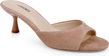 A rounded topline and minimalist silhouette further the streamlined aesthetic of a leather slide sandal grounded by a foam-cushioned footbed and cylindrical heel.