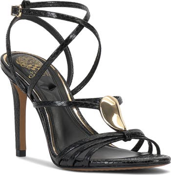 Polished hardware accentuates the strappy silhouette of this elegant sandal set on a lofty stiletto heel.