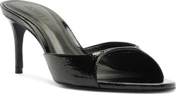 Glossy patent leather amplifies the everyday glamour of this modern, minimalist sandal set on a lofty heel.