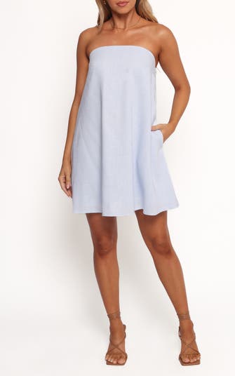 A clean-cut, modern silhouette defines this strapless minidress made from a lightweight blend of cotton and linen.