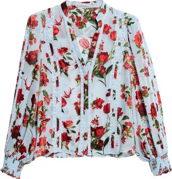 Lovely lace trims this blousy silk-enriched top romanced by rich roses and accented with smocked cuffs.