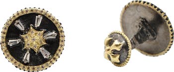 Inspired by old-world treasures, these ornate cuff links are rendered in 18-karat gold and blackened sterling silver set with champagne diamonds and sapphires. The geometric stones are used as the rays of a striking star, while a crest on the back gives them a regal touch.
