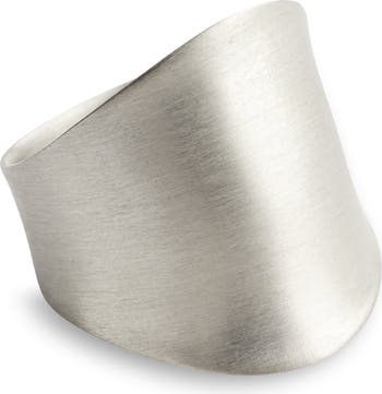 The wide curved armor band reflects the strength and protection of our tight knit community. This sterling silver ring is a clean and sculptural piece, while the natural curve and semi-matte finish adds a soft boldness to any look. | o Approx. 22.5 mm thick o AG 925 Sterling Silver o Finish: Matte o Nickel free o Handcrafted in Korea