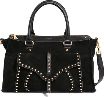 Domed studs and sleek leather trims add an edgy aesthetic to a supple suede satchel featuring ample compartments and an optional crossbody strap for on-the-go convenience.