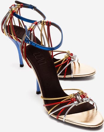 An expressive heeled shoe that blends vibrant multi-strap composition with a radiant metallic finish for a bold, artful statement