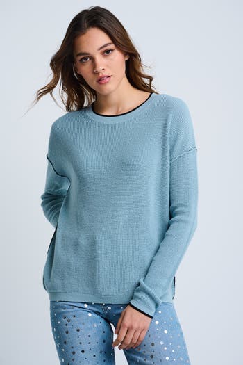 An everyday staple with a modern twist, the Around Town sweater is crafted from a soft Cotton-Cashmere blend and features a waffle stitch texture with contrast seam and cuff detailing. Its colorblock back and drop shoulders create visual interest and relaxed appeal. Finished with ribbed edges for a clean fit.