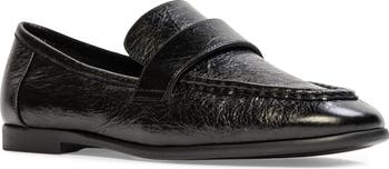 A crinkled leather upper and slender moc toe add contemporary elements to a leather loafer grounded by a cushioned footbed for comfortable wear.