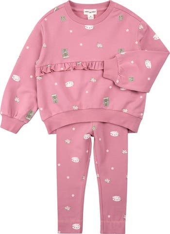 A row of frilly ruffles instantly sweeten a crewneck sweatshirt paired with matching leggings that look great together or can be worn with existing wardrobe favorites.