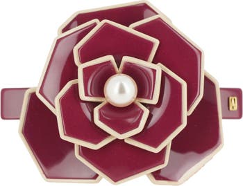 Typical of the Art Deco features, cut-off corners have replaced the curves of the petals, making it possible to stack up to four rows of symmetrical petals without affecting the overall lightness. The rhythm of the caramel or beige piping creates a movement that pimps up the couture mindset of this detail. In the heart, a shimmering pearl focuses the attention and reminds of the flower’s sensuality. Utmost chic, this hair barrette is a genuine hair jewel easy to use thanks to its safe and handy automatic fastening. Wear it on a daily basis in ponytail with medium dense hair or half-up styles with thin hair. Lenght 8cm
