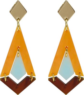 Sharp and stylish, with a touch of swing. The Art Deco influence is strong in these geometric drop earrings; and the beautifully matched colourways have a vintage vibe too. They’ll catch the light and shimmer all the way to the dance floor with you. Our gold ear tops are cast from solid brass, plated in 18ct gold. Each is finished with a surgical steel ear post, soldered into place for strength.