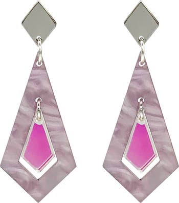 Be on point with these striking geometric beauties. The swirling marbled-effect colour of the outer shape, and the bold mirror acrylic of the inner shape, have a strong vintage vibe; they’ll catch the light and shimmer all the way to the dance floor with you. Our silver ear tops are cast from solid brass, plated in rhodium. Each is finished with a surgical steel ear post, soldered into place for strength.